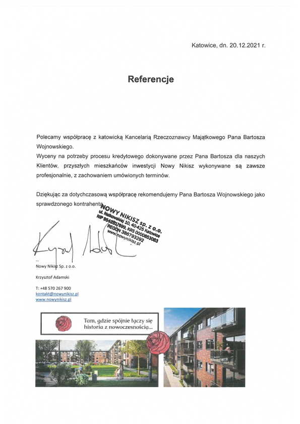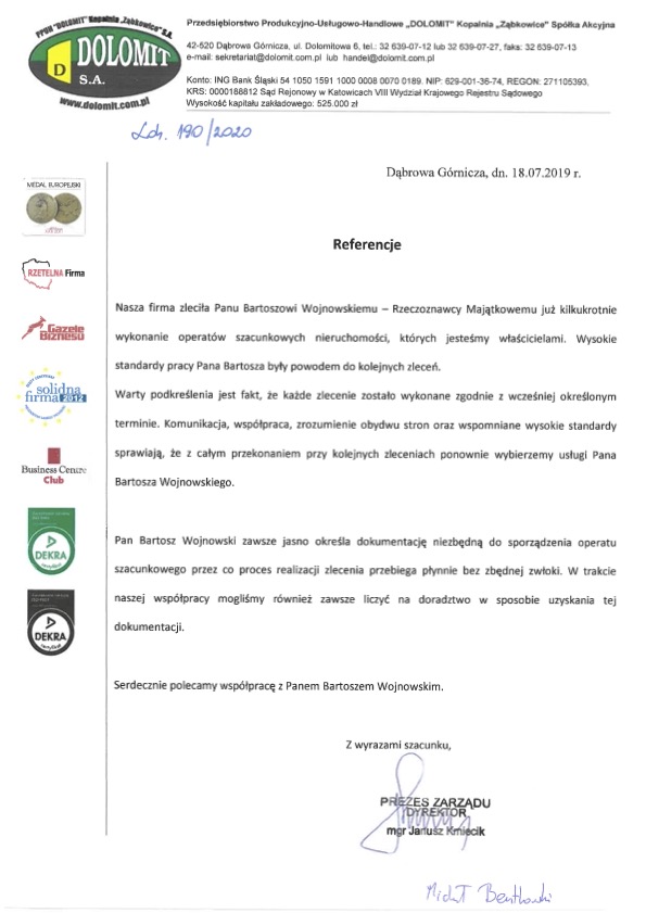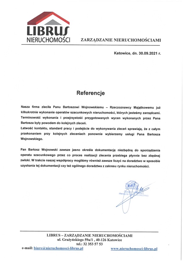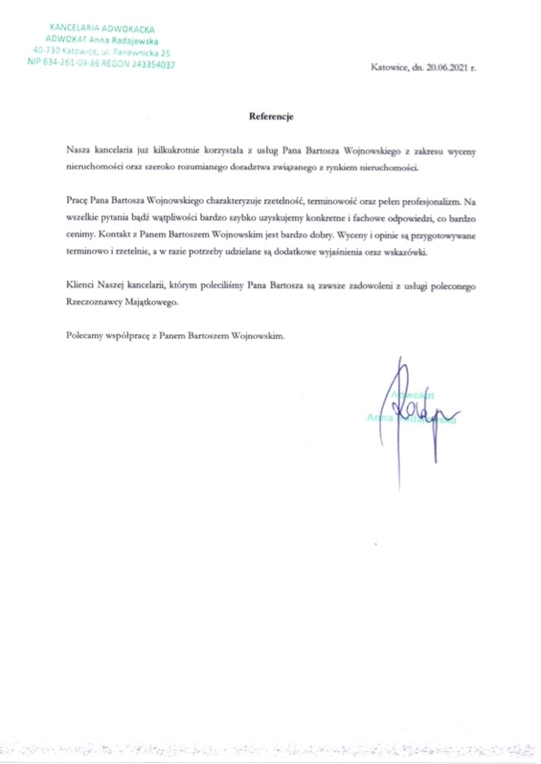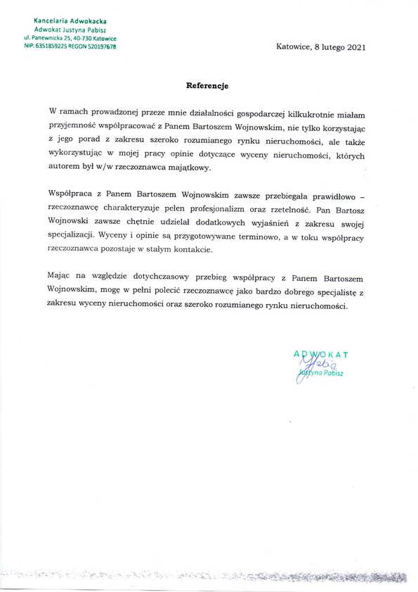 Pisemna opina o wartości nieruchomości przygotowana przez Rzeczoznawcę Majątkowego.